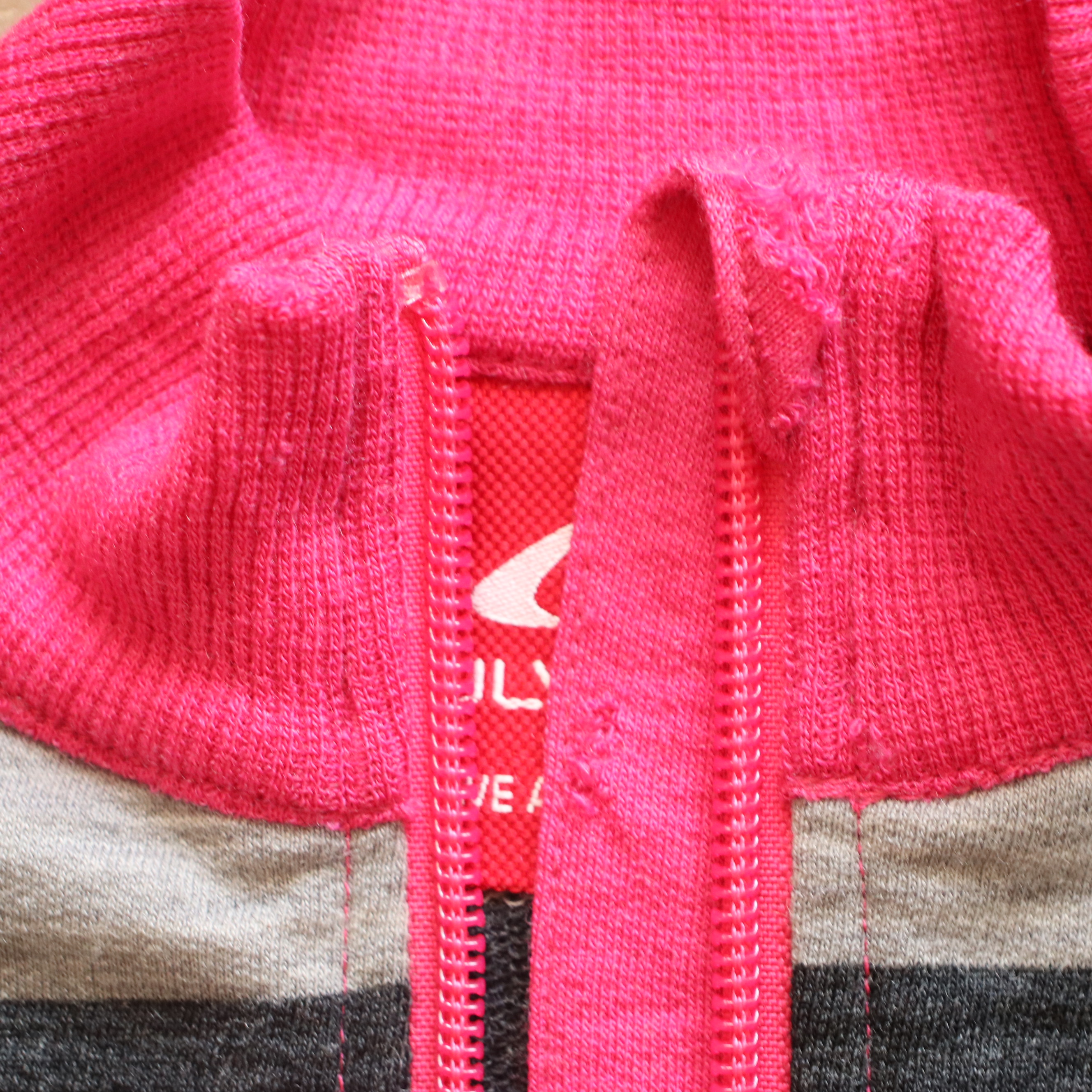 Stan: uszkodzona osłonka na suwak pod brodą i rant ściągacza
